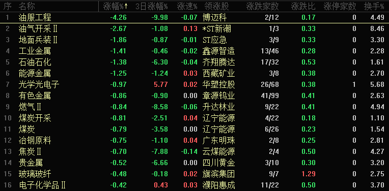 今日板块跌幅靠前的是油服工程、油气开采、地面兵装、工业金属、能源金属、光学光电子、有色金属、燃气和煤炭等。这类板块多由消息刺激引发短期反弹,反弹后易形成补跌,近期逆势走强的油服工程、油气开采等跌幅居前,昨日异动拉升的光学光电子也开启调整。这一走势印证了 “选热点不能仅看消息刺激,需聚焦具备中长期反弹逻辑的板块”,操作上应避免追涨,等待回踩机会再布局。