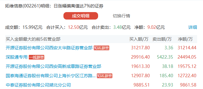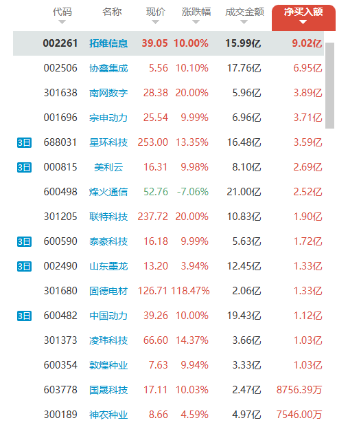 从净买入额看,拓维信息(9.02 亿)、协鑫集成(6.95 亿)、南网数字(3.89 亿) 占据前三,合计净买入超 19.86 亿,占榜单前 10 名净买入总额的 60% 以上,资金向核心龙头集中的趋势极为明显。