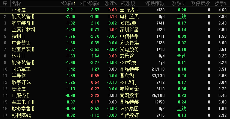 今日跌幅靠前的板块为:小金属、航天装备、航空装备、金属新材料、特钢、广告营销、地面兵装、林业、航海装备、国防军工等,军工板块整体领跌。