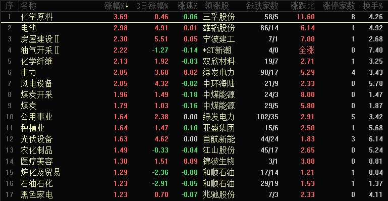 今日行业板块涨幅靠前的化学原料、电池、房屋建设、油气开采、化学纤维、电力、风电设备、煤炭开采、煤炭和公用事业等。四维分析来看,行业板块有63个上涨,其中有7个板块涨幅超过2%,下跌板块有94个,个股方面,两市上涨家数是2060家,涨停67家,下跌家数是3284家,跌停2家。