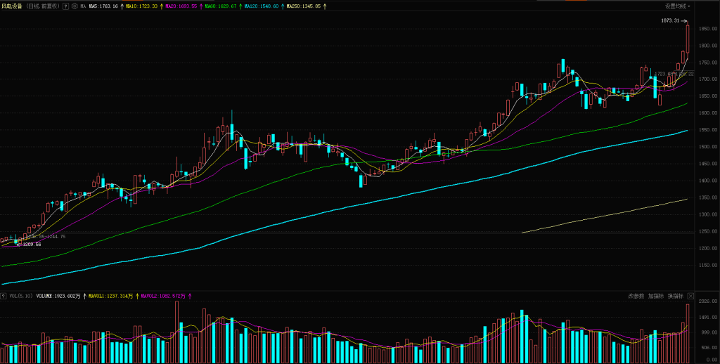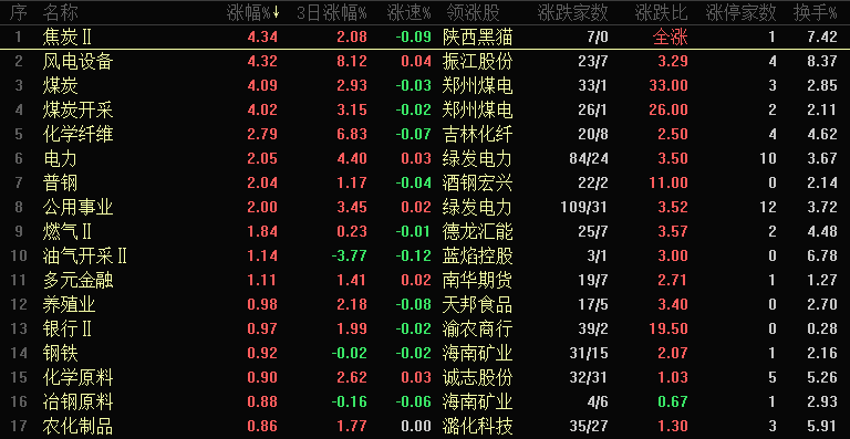 今日行业板块涨幅靠前的是焦炭、风电设备、煤炭、煤炭开采、化学纤维、电力、普钢、公用事业、燃气和油气开采等。四维分析来看,行业板块有27个上涨,其中有8个板块涨幅超过2%,下跌板块达到130个,个股方面,两市上涨家数是1494家,涨停64家,下跌家数是3893家,跌停6家。