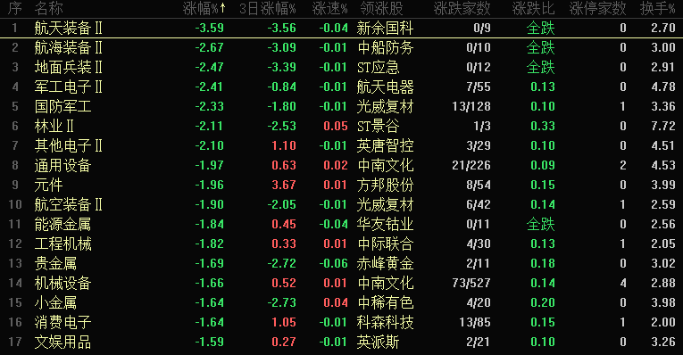 今日跌幅靠前的板块为航天装备、航海装备、地面兵装、军工电子、国防军工、林业、其他电子、通用设备、元件和航空装备等,军工板块集体领跌。军工持续调整的核心原因在于:板块内多数标的前期涨幅巨大,主升行情已结束,2025 年累计涨幅较高,叠加商业航天概念炒作,个股普遍处于高位。基本面未发生重大变化,但技术面存在充分调整需求,短期休整后未来仍有机会。