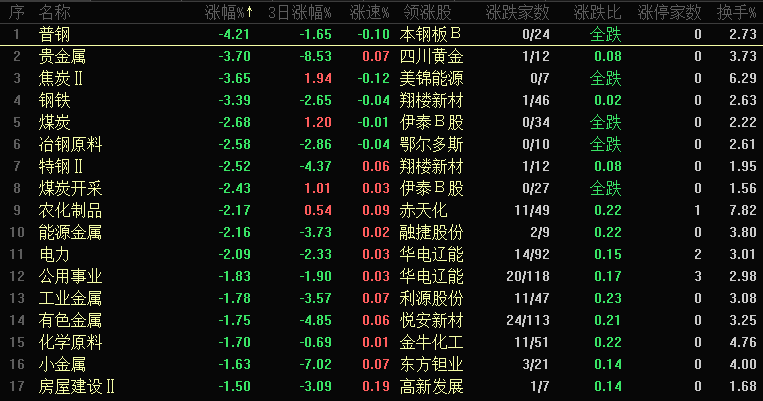 今日跌幅靠前的是普钢、贵金属、焦炭、钢铁、煤炭、冶钢原料、煤炭开采、农化制品和能源金属等。钢铁、金属、煤炭等周期板块集体调整,大宗商品中长期反弹后,部分品种涨幅过大,高位形成筹码峰,上方套牢盘压制明显(金属类尤为突出),短期或持续对指数形成压力,缺乏基本面支撑的品种后续可能延续调整。