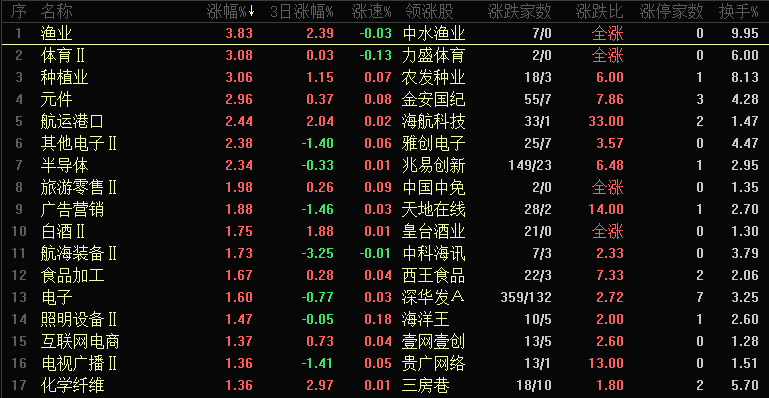 【热点板块】今日行业板块涨幅靠前的是渔业、体育、种植业、元件、航运港口、其他电子、半导体、旅游零售、广告营销和白酒等。四维分析来看,行业板块有92个上涨,其中有7个板块涨幅超过2%,下跌板块有64个,个股方面,两市上涨家数是2843家,涨停60家,下跌家数是2494家,跌停10家。