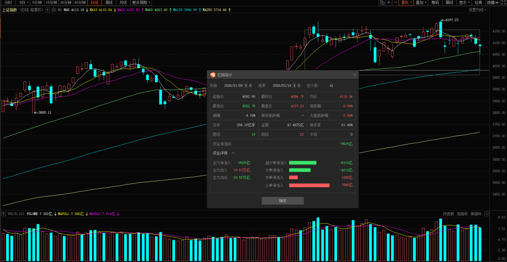 【技术分析】近期大盘分时及小周期、日线、周线均呈现震荡结构,围绕 4100 点上下震荡已持续 41 个交易日,核心原因有四: