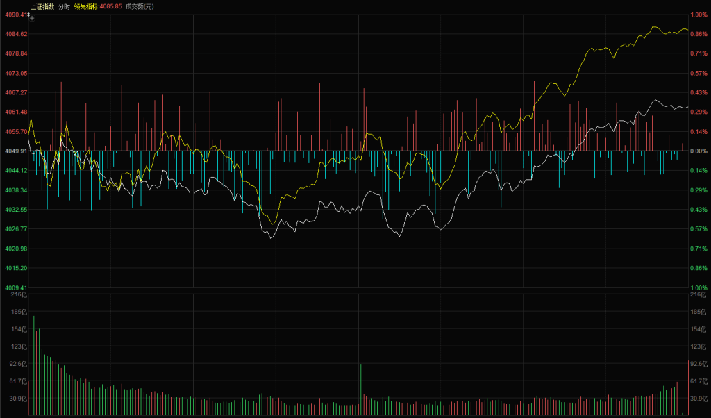 【市场观察】上证指数小幅高开 4053 点,开盘后再度形成震荡下行结构,黄白线走势混乱。11 点左右创出日内低点 4023 点,午后开盘又两次下探并形成第二、第三个低点,但均未跌破 4023 点,分时级别呈现底底抬升走势,这是明确的分时止跌信号。随后指数震荡上行,最终上证指数报收 4062 点,上涨 0.32%;创业板午后同步震荡上行,最终报收 3346 点,上涨 2.02%。