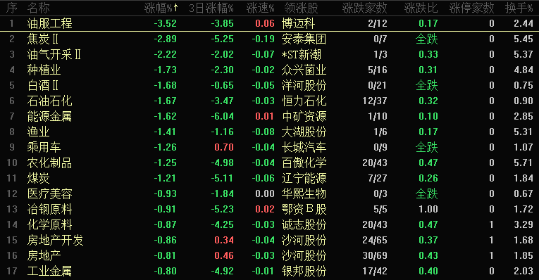 今日板块跌幅靠前的是油服工程、焦炭、油气开采、种植业、白酒、石油石化、能源金属、渔业、乘用车和农化制品等。石油、焦炭等资源板块进入调整:石油板块 3 月 2 日跳空高开启动行情,3 月 4 日见顶后震荡调整,当前已回吐前期大部分涨幅,套牢盘集中,需警惕跳空突破类品种的洗盘或出货风险,操作上仍需坚守 “顺趋势、逆操作” 策略。