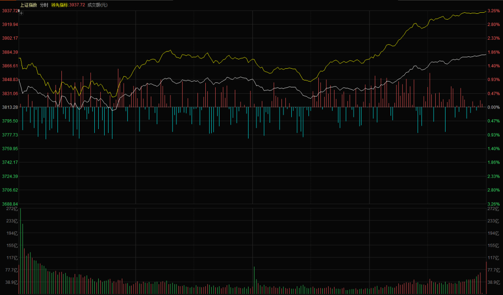 【市场观察】上证指数高开 3849 点,全球主要股市同步高开,A 股高开后再度涌现抛盘 —— 中长阴线后,技术盘获利离场属正常现象,指数震荡回落至日内低点 3807 点。10:30 左右大盘启动缓慢震荡上行,分时形成两波反弹,13:30 后第二波反弹力度增强并伴随放量迹象。最终上证指数报收 3881 点,上涨 1.78%;创业板报收 3251 点,上涨 0.50%。