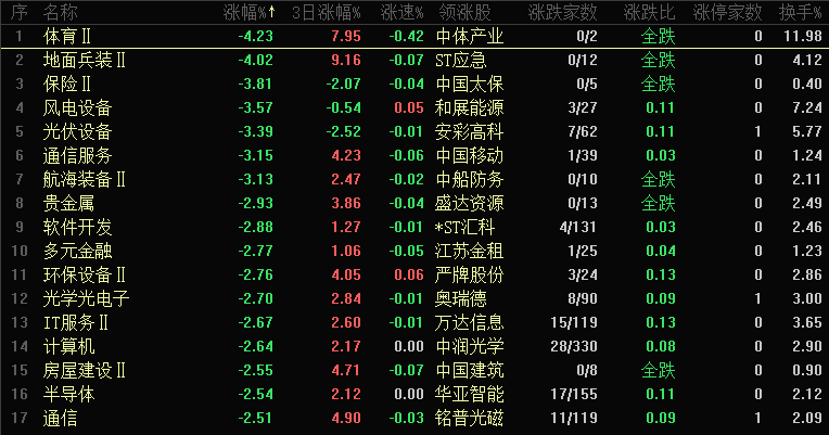 今日板块跌幅靠前的是体育、地面兵装、保险、风电设备、光伏设备、通信服务、航海装备、贵金属、软件开发和多元金融等,36 个板块跌幅超 2%。板块轮动呈现 “昨日领涨、今日领跌” 的特点,保险板块持续调整收出中阴线,对指数形成较大压制,其止跌节奏将影响大盘整体企稳进程。