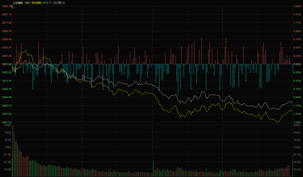 上证指数低开 3924 点,开盘后尝试上冲至日内高点 3937 点,但反弹力度极弱,持续时间不足 15 分钟,随后再度进入震荡下行走势。全天黄白线同步向下,黄线领跌,伴随资金持续净流出,分时下跌结构与前期阴线调整一致,面对上方阻力位,多方未组织起有效反击。最终上证指数报收 3889 点,下跌 1.09%;创业板早盘冲高后震荡下行,最终报收 3272 点,下跌 1.34%。