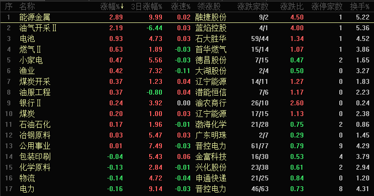 【热点板块】今日行业板块涨幅靠前的是能源金属、油气开采、电池、燃气、小家电、渔业、煤炭开采、油服工程、银行和煤炭等。四维分析来看,行业板块有13个上涨,其中有2个板块涨幅超过2%,下跌板块达到144个,个股方面,两市上涨家数916家,涨停51家,下跌家数4493家,跌停13家。