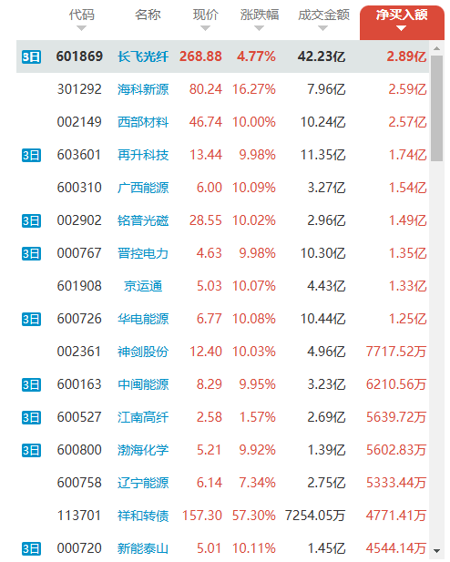 从净买入额看,长飞光纤(2.89 亿)、海科新源(2.59 亿)、西部材料(2.57 亿) 占据前三,合计净买入超 8.05 亿,占榜单前 10 名净买入总额的 64% 以上,资金向 “机构重仓 + 高景气催化” 核心标的集中的趋势极为明确。
