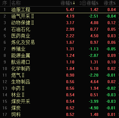【热点板块】今日行业板块涨幅靠前的是油服工程、油气开采、动物保健、石油石化、医药商业、炼化及贸易、养殖业、能源金属、航运港口和化学制药等。四维分析来看,行业板块有23个上涨,其中有5个板块涨幅超过2%,下跌板块达到134个,个股方面,两市上涨家数1052家,涨停32家,下跌家数4378家,跌停16家。