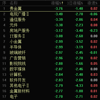 今日板块跌幅靠前的是贵金属、电视广播、通信服务、元件、房地产服务、IT 服务、小金属、半导体和玻璃玻纤等。贵金属板块短期止跌后弱反弹,再度收出中阴线;科技板块再现 “一日游” 行情,昨日反弹后今日再度调整,以半导体为例,近期阴阳 K 线交替,日线横盘震荡,走势犹豫,暂未到布局时机。