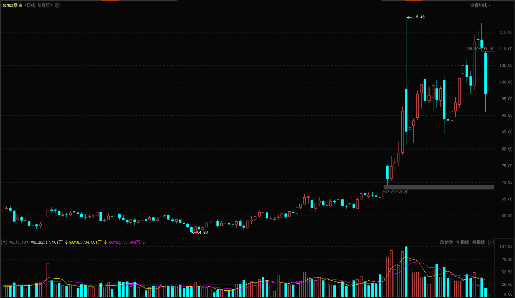 今日板块跌幅靠前的是油服工程、油气开采、石油石化、煤炭开采、煤炭和医药商业等,石油、煤炭板块集体调整,其中油服工程、油气开采板块跌幅均超 5%。受原油价格波动影响,原油昨日上涨未突破前期 119 点高点,今日盘中最大跌幅接近 20%,直接带动石油相关板块走弱;石油板块前期逆势上涨后,此次补跌已成必然,只是时间问题。