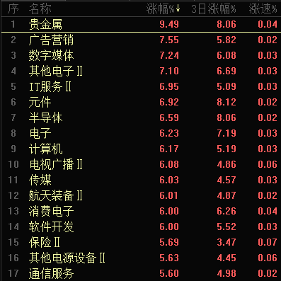 今日行业板块涨幅靠前的是贵金属、广告营销、数字媒体、其他电子、IT服务、元件、半导体、电子、计算机和电视广播等。四维分析来看,行业板块有151个上涨,其中有124个板块涨幅超过2%,下跌板块有6个,个股方面,两市上涨家数5174家,涨停135家,下跌家数只有310家,跌停12家。