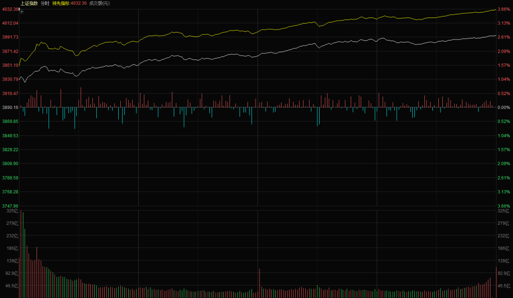 上证指数高开 3930 点,高开源于外围冲突出现转机,亚太股市集体大涨带动 A 股跟涨。高开后指数呈现稳步震荡上扬走势,近期首次出现 45 度角上推的反弹结构,资金持续流入,黄白线同步上涨且黄线全天领涨,分时反弹结构强势,盘中未出现大幅波动。最终上证指数报收 3995 点,上涨 2.70%;创业板报收 3364 点,上涨 5.91%。