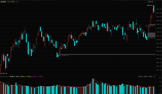 重点说一下创业板,4 月 7 日收一颗十字星,4 月 8 日直接跳空高开收中阳线,展开一波快速反弹,连续创出新高。今天最高点 3599 点,创出了 10 年新高,创出新高之后却出现高位跳水,收出了一颗中阴线,这颗中阴线吞掉了昨天的阳线,形成阴包阳的走势。