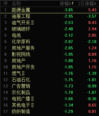 今日板块跌幅靠前的是能源金属、油服工程、油气开采、玻璃纤维、电池、化学原料、房地产服务、影视院线、房地产和房地产开发等。能源金属、石油等强周期板块都出现调整,资金流入防御板块,当前资金还是比较谨慎的。同时创业板龙头个股资金流出幅度比较大,阶段性任务完成之后这类高位品种也要当心补跌风险。
