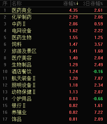 今日行业板块涨幅靠前的是医药商业、化学制药、中药、电网设备、医药生物、饲料、旅游及景区、医疗美容、生物制品和酒店餐饮等。四维分析来看,行业板块有44个上涨,其中有3个板块涨幅超过2%,下跌板块113个,个股方面,两市上涨家数1841家,涨停68家,下跌家数3541家,跌停14家。