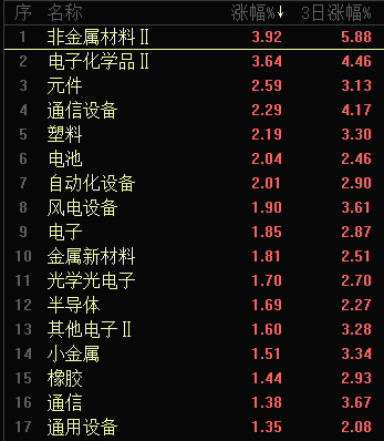 今日行业板块涨幅靠前的是非金属材料、电子化学品、元件、通信设备、塑料、电池、自动化设备、风电设备、电子和金属新材料等。四维分析来看,行业板块有68个上涨,其中有7个板块涨幅超过2%,下跌板块有89个,个股方面,两市上涨家数2396家,涨停76家,下跌家数2986家,跌停7家。