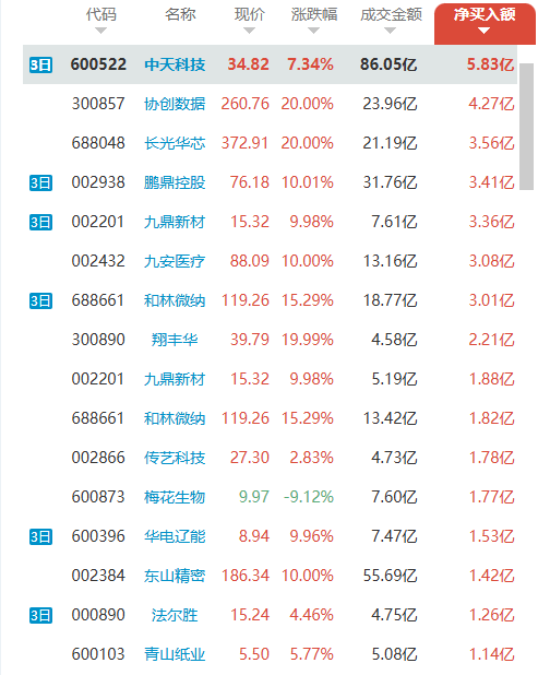 从净买入额看,中天科技(5.83 亿)、协创数据(4.27 亿)、长光华芯(3.56 亿) 占据前三,合计净买入超 13.66 亿,占榜单前 10 名净买入总额的 68% 以上,资金向 “AI 算力 + 半导体” 双主线核心标的集中的特征极为明显。