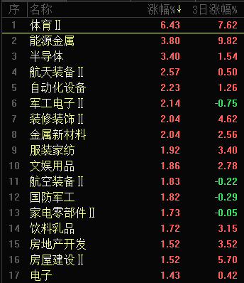 今日行业板块涨幅靠前的是体育、能源金属、半导体、航天装备、自动化设备、军工电子、装修装饰、金属新材料、服装家纺、文娱用品等。四维分析来看,行业板块有98个上涨,其中有8个板块涨幅超过2%,下跌板块有59个,个股方面,两市上涨家数2878家,涨停98家,下跌家数2461家,跌停52家。