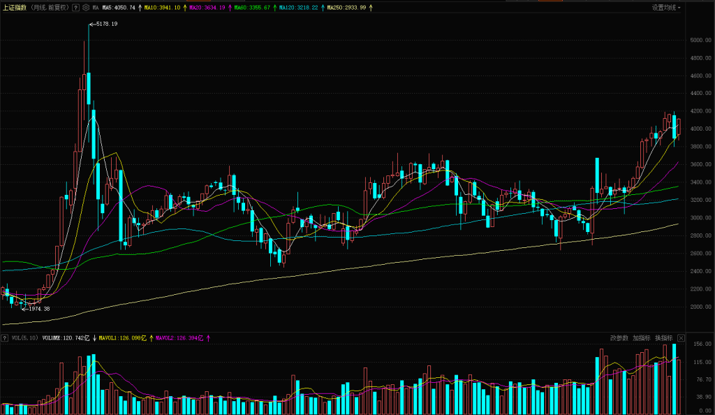今天这颗K线同时收日线、周线和月线。上证指数日线收出一颗小阳线,继续冲击4100-4150点压力区域。这个区域想一次性直接突破难度较大,需要反复消化,均线呈现多头排列的走势。周线形成了一波四连阳,站上4100点,均线也是多头排列,有望继续反弹冲击前期高点4197点。月线来看,指数依托10日均线形成止跌,连续2个月都是打到10日均线附近止跌企稳。4月份收出一颗阳线,涨幅达到5.66%,但是没有完全吞掉3月份这颗中长阴线。日线、周线和月线整体来看都是处于多头排列的走势。虽然3月份受中东地区事件的影响出现了一些波动,多方主力资金依然可以掌控盘面,中长期仍处于反弹趋势当中。创业板短期走势相对复杂一点,近期突破了几个前期高点,有过顶洗的需求,短期会有调整。但周线和月线均线也是多头排列状态。