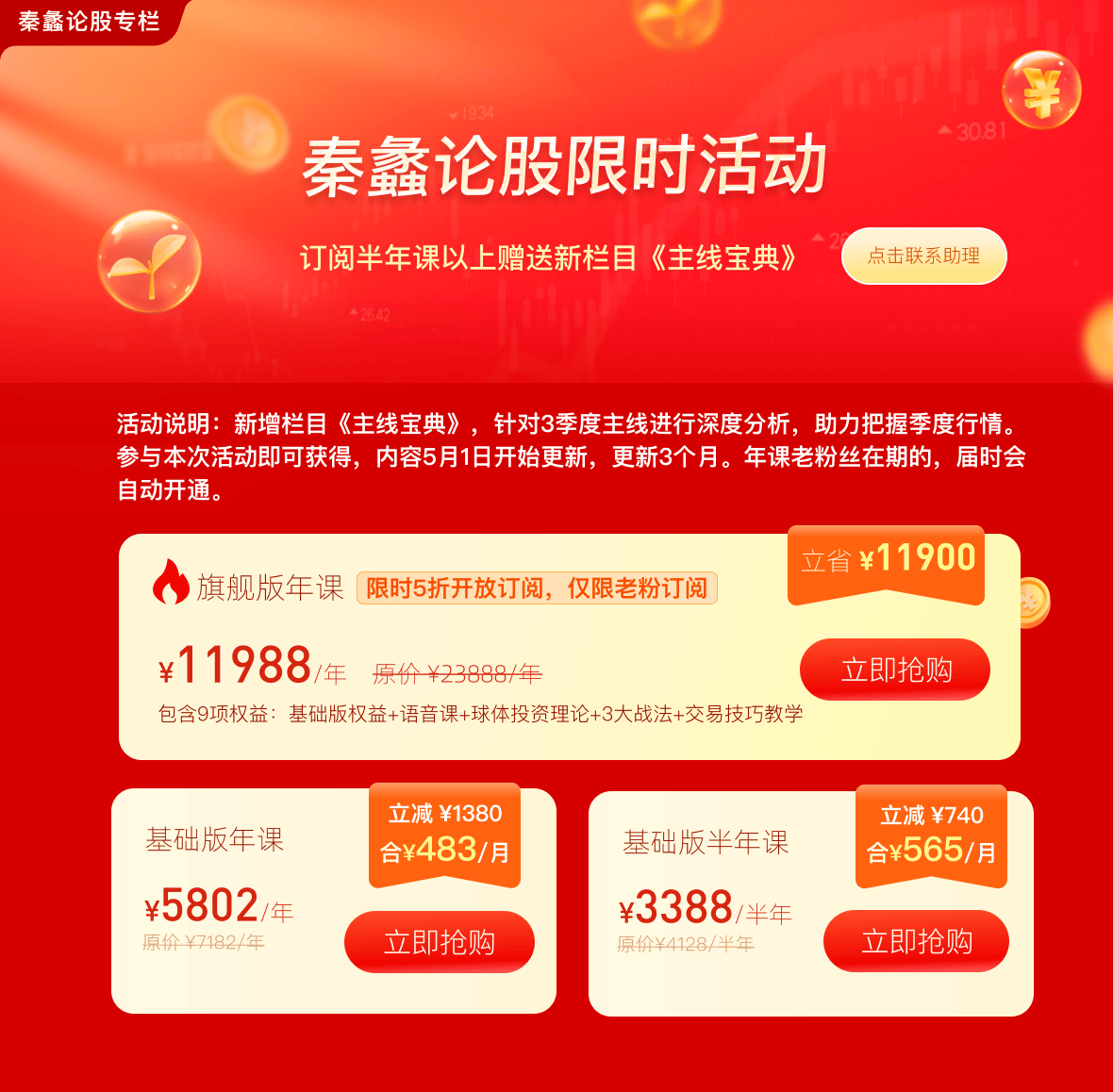 ·【A股午评:创业板指半日涨0.82%,CPO、PCB等算力硬件股持续爆发】A股三大指数早盘涨跌不一,截至午盘,上证指数跌0.3%,深证成指涨0.33%,创业板指涨0.82%,北证50涨0.03%。全市场成交额15896亿元,较上日成交额放量1198亿元,全市场超3700只个股下跌。板块题材上,CPO、PET铜箔、PCB、光刻机、光纤、存储芯片、有色金属、电池板块涨幅居前;旅游及酒店、创新药、油气开采及服务、教育、粮食概念股跌幅居前。盘面上,光模块龙头中际旭创一季度业绩超预期,反映AI产业链需求旺盛,CPO、PCB、光纤等算力硬件股集体走强,其中剑桥科技、光迅科技、华盛昌等10余股收获涨停。4月锂电排产高位延续,电池产业链反复活跃,圣阳股份录得7连板。小金属板块维持近期涨势,云南锗业封板。另一方面,CRO、创新药概念股震荡调整回吐前期部分涨幅,药明康德盘中跌超5%。贵州茅台公布的2025年财报出现营收、利润首次负增长,股价盘中跌超4%。03:36·【重要提示】周线级别底部已经进入后半段,第三波行情呼之欲出,这是年内最好的一波中级行情。我们是3月27日开始抄底,如今底部建仓已经接近尾声。为了让新老粉丝都能上车,我们开启了年内最大的优惠活动。注意,未来三个月将不做任何活动,追高布局不是我们的风格。03:37·基础版半年课限时开放订阅,立减740元,年课减1380元。旗舰版年课5折开放订阅。赠送:凡是订阅半年课以上的学员送《主线宝典》专栏研报,涉及重点大乘股和长线股的价值挖掘。老粉半年课以上的可以找助理开通新栏目。 注意,本次活动是近期最后一次活动。活动力度大,因此限额。03:37·大家下午好05:09