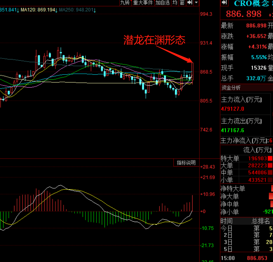 从技术形态来看,CRO板块正在孕育月线级别反弹,MACD月线金叉即将黏合。一旦MACD月线金叉确认,CRO板块将正式展开月线级别反弹;从中线技术形态来看,CRO板块中级调整刚刚确认结束,且成功突破半年线,且呈潜龙在渊形态;从短线技术形态来看,CRO板块今天大涨4.31%,且放量突破半年线,短线资金抢筹迹象明显,若短线缩量回踩可择机低吸潜伏。