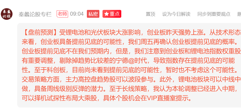 【市场分析】今天在固态电池大涨的带动下,创业板收涨2.73%再创反弹新高。半导体今天缩量震荡,盘中寒武纪一度跌近5%,尾盘收跌1.16%。中芯国际盘中一度跌超2%,收盘涨幅接近3%。科技龙头轮番拉升可能导致科技股逼空行情继续,科创板和创业板目前处于中线上升趋势中,只要中线不破位不得盲目看空。但是要注意,双创指数目前是日线顶背离雏形结构,一旦中线破位,可能触发中级调整。交易策略方面,针对半导体、人工智能和锂电池板块的逼空式反弹,可小仓位波段参与,控制好仓位不可过于激进。此外,我们注意到近期医药医疗板块出现超预期杀跌,正在构筑中期底部,一旦出现底部反转结构要果断抄底。我们坚信,机会都是跌出来的,风险都是涨出来的。