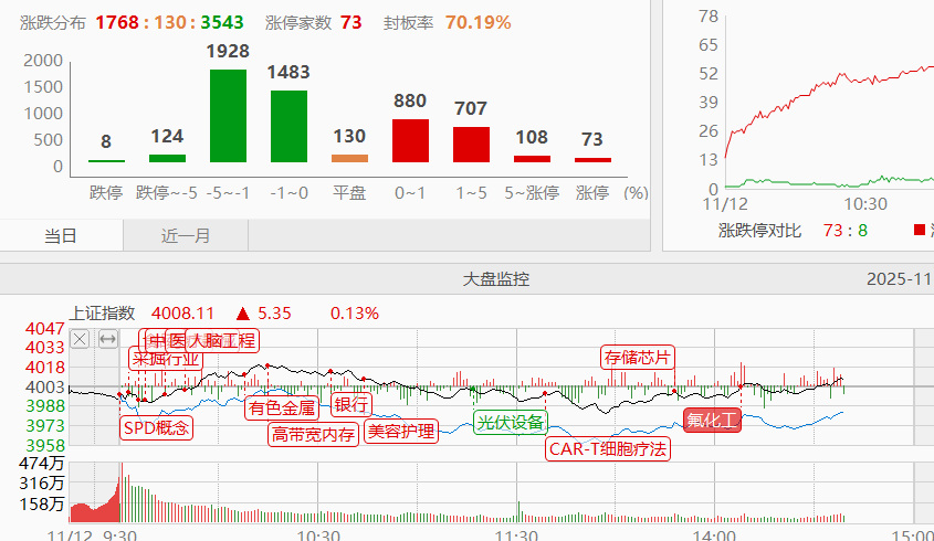 上午开盘科技方向延续弱势表现,出海算力等AI方向继续调整,资金拉了防御属性的消费、医药,甚至避险的石油等板块也有所异动。午后创业板探底回升,存储芯片、锂电池资金回流,导致消费、医药筹码纷纷松动,整体上还是一个轮动属性拉满的盘面,各方资金都在争夺盘面注意力。
