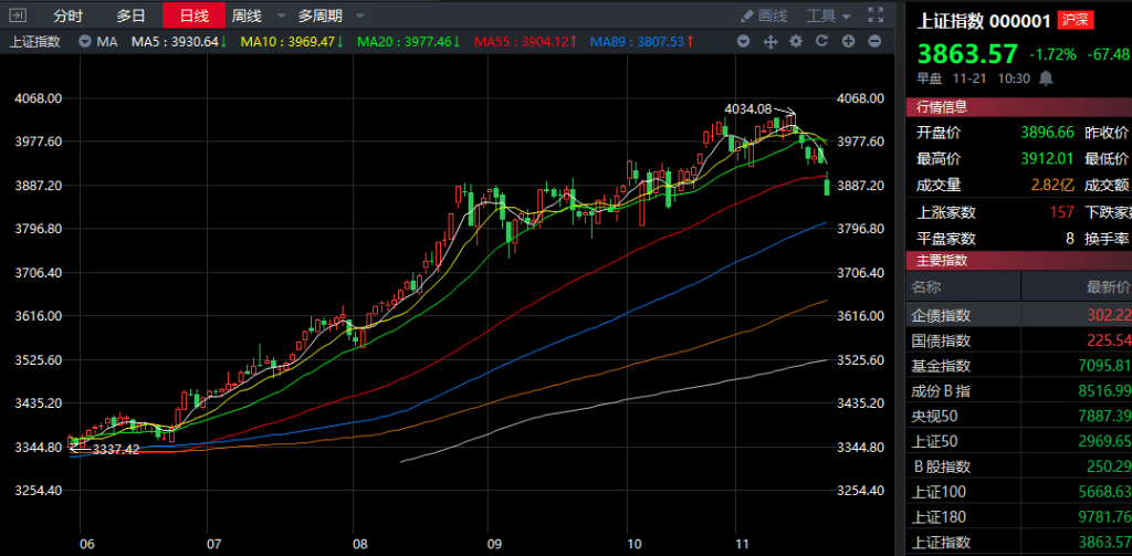 正如今早内部提示的那样,近期A股市场需警惕开盘出现向下的跳空缺口,这一情况一旦发生,若短期无法回补,很可能引发中级调整。从今日上午的走势来看,形势较为严峻,沪指与创业板指目前均已运行至55天线下方,中期技术走势正朝着不利方向发展。后面我们必须高度重视这一变化。