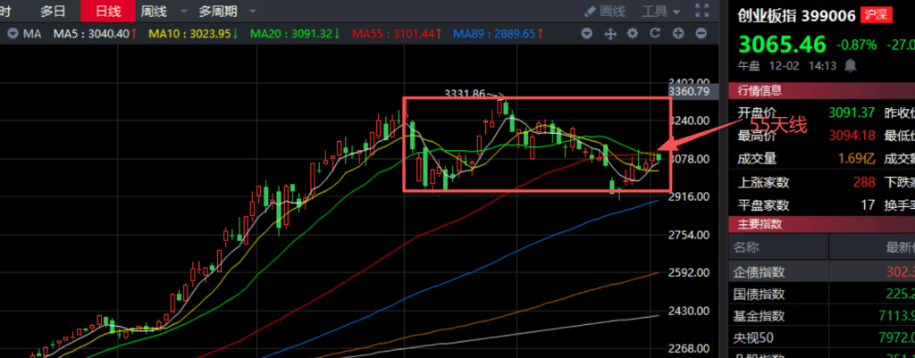现在创业板指数被55日线打头,沪指缺口迟迟不补,这就证明场内多头信心不足,反弹的动力来源于惜售,但是靠惜售无法启动新一波行情。从中期视角来看,目前创业板就是一个大的箱体震荡,目前重心持续下移,有随时跌破箱体走下行趋势的风险。