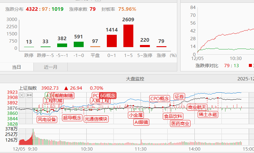 热点来看,昨天提到商业航天超预期走强,而且是大票走强,代表机构的态度,非短期行为,今天依然有不错的表现,可以继续跟踪。消费方向近期也频繁异动,年终岁尾,消费方向不会缺席,可以适当关注。