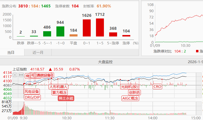 热点方向来看,昨天板块全面高潮的商业航天今天有所分化,板块指数冲高回落,留下上影线,从技术上来看,要注意板块从主升浪转为区间震荡。AI应用方向趁商业航天分歧之际上位,低位新秀板块,关注这两个方向之间的拉扯。