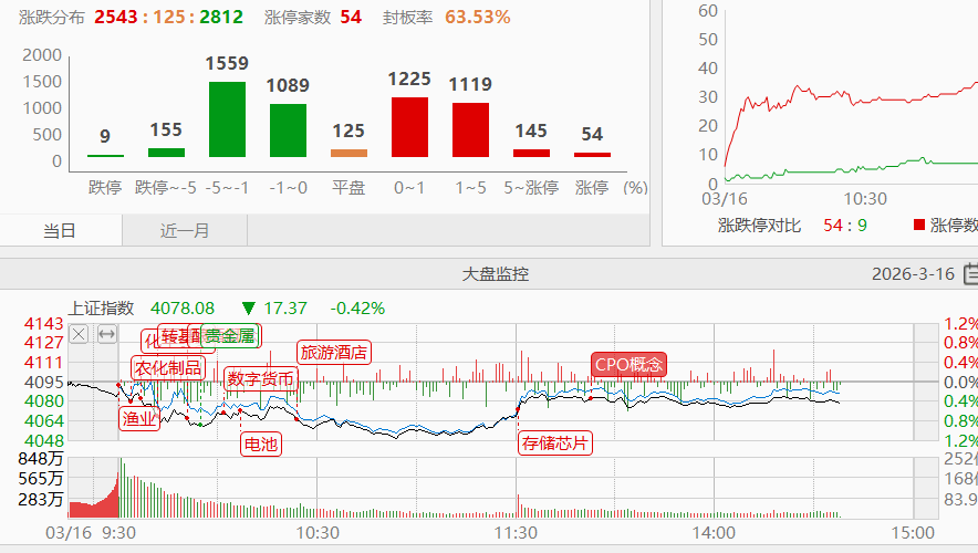 热点方向,上周五电力板块大分歧,今天负反馈加剧,板块继续下行。上周五电力板块龙头跌停就是一个重要信号,龙头是风向标,龙头倒下,那么短期板块的预期也就不在。化工方向今天冲高回落,但是这个方向不看结束,因为即便是短期中东消息面和缓,这个方向长周期受益于反内卷的逻辑还在,况且目前中东乱局没有丝毫缓解,还可以继续观察
