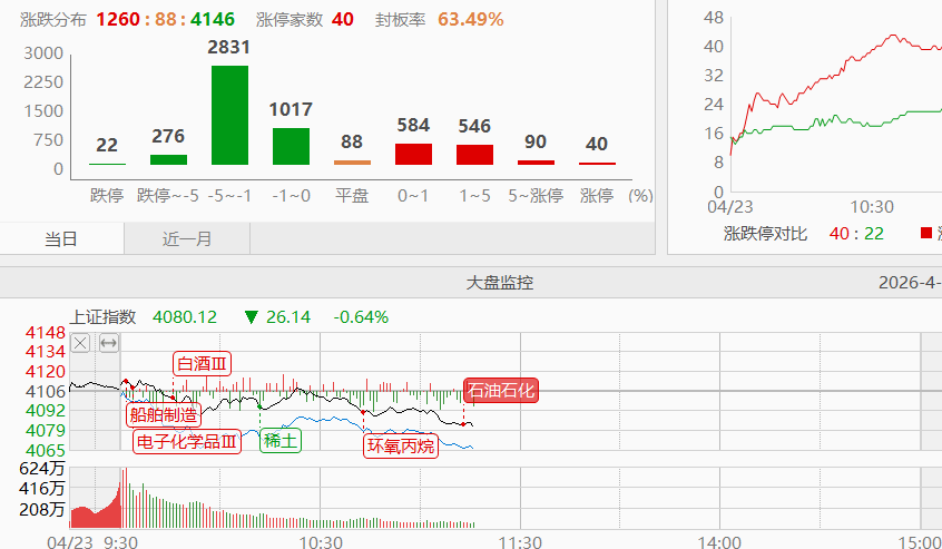 个股今天也是跌多涨少,4000多家下跌,跌停板数量增加到10只,从4.8号市场启动新行情以来,已经持续两周时间,今天是科技方向第二次明显的分歧调整,这里不能说科技方向已经彻底结束,因为今天跌的凶主要是CPO二线跟风票,龙头易中天整体负反馈不够大,创业板还在5日线上方,燃气轮机、算力、商业航天等还在撑场面。但是这里科技线大概率从主升开始转震荡,这里要注意是否有新方向出来接力,注意新旧切换。